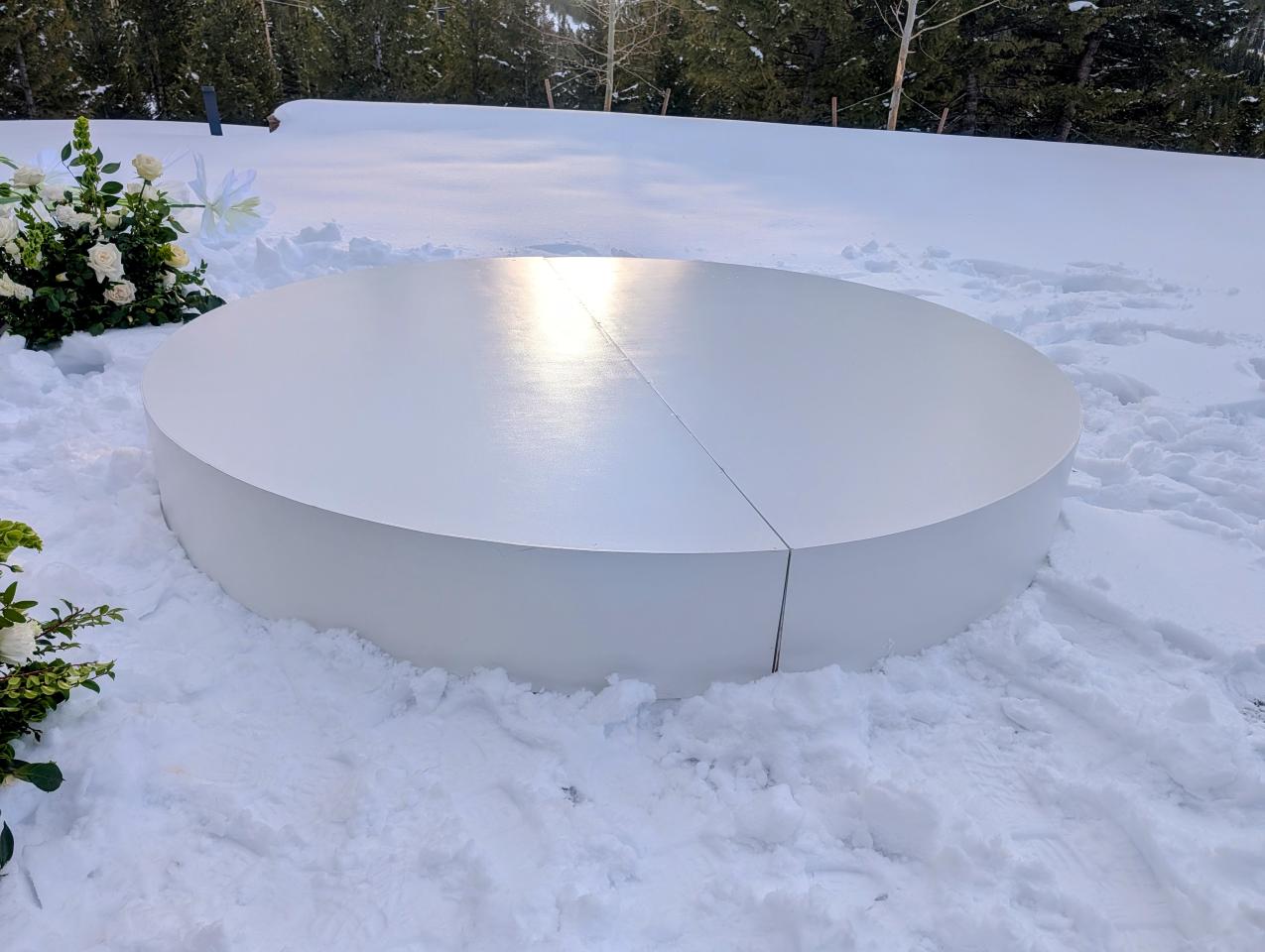 8′ Diameter by 12″ High. This round platfrom will elavate the bride and groom to the next level!